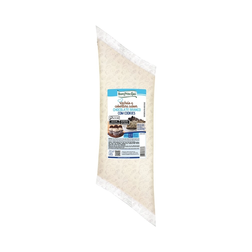 CONFEITARIA>RECHEIOS E COBERTURAS>Recheio E Cobertura Sabor Chocolate Branco Com Cookies Bisnaga Bom Princípio 1,01Kg